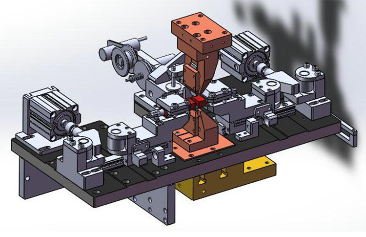 2.1.3.焊接電極工裝:除導電件外,工作台麵以上工裝夾具(包括台麵)均采用不鏽鋼材料製作,上下電極座采用鍛打紫銅導電,采用鎢塊狀電極,夾緊銅板固定在電極座上,可快速更換,裝夾方便。側擋塊材質采用KCF材料,楔形機構夾緊方式。電極焊接部分和輔助電極分開,便於維護和更換。更換麻豆妖精观看在线時,需人工更換相應電極及定位件。